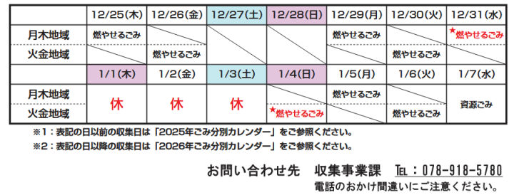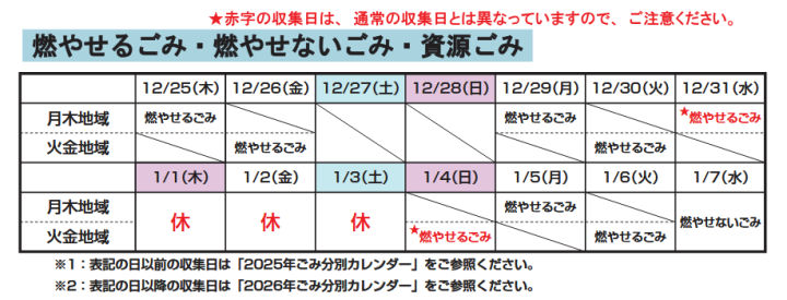 燃やせるごみでは、月・木収集地区の年始1月1日分が12月31日(年内最終)に、火・金収集地区の1月2日分が1月4日(年内最終は12月30日)に変更されていますのでご注意を。