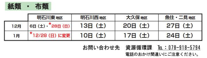 明石川東地区の紙類・布類の収集は1月3日には行われず、12月28日に変更されます。