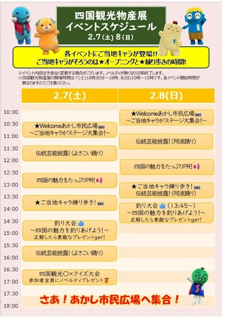 会場では特産品の販売や観光案内、ご当地キャラが大集合するほか、四国観光の○×クイズ大会などが実施されます。正解数が多かった方には素敵なプレゼントもありますよ。