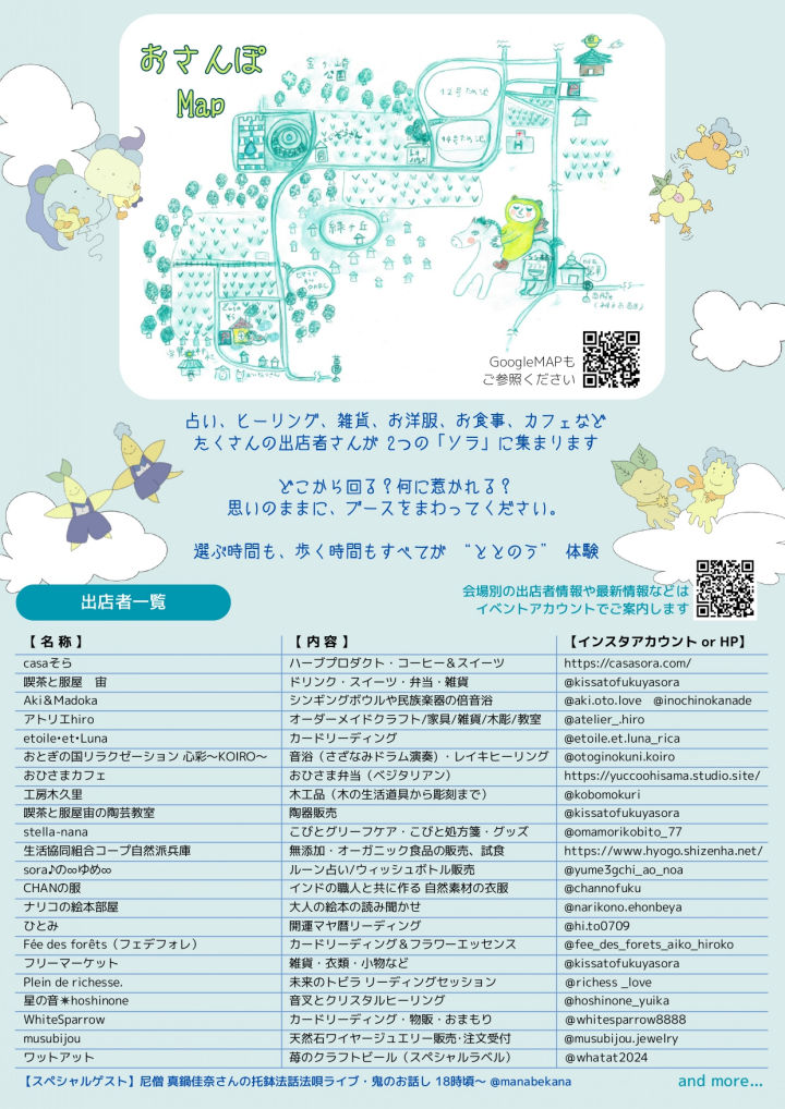 当日は、占いやヒーリング、雑貨や洋服の販売、食事やカフェなど多彩なブースが並びます。