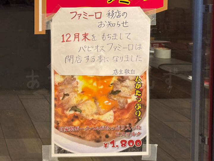 明石駅前・パピオスあかし1階・ときめき横丁のピザ店「ファミーロ」が閉店していました。