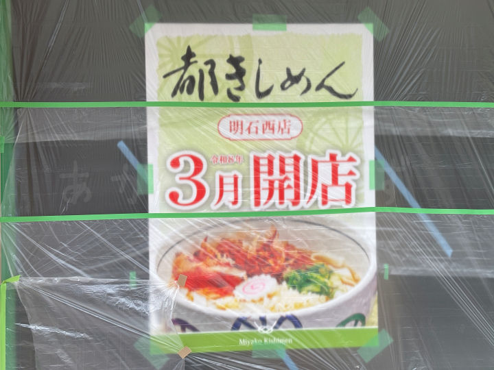 明石駅の西側、国道2号線沿いに「都きしめん 明石西店」がオープンするようです。