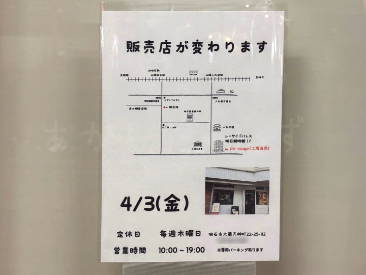 4月3日(金)以降は、浜国沿いのマンション「シーサイドパレス明石錦明館」1階にある工場併設の店舗での直売となります。